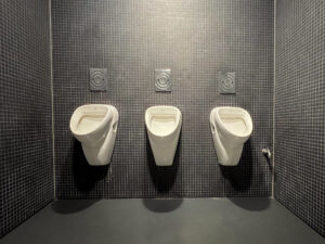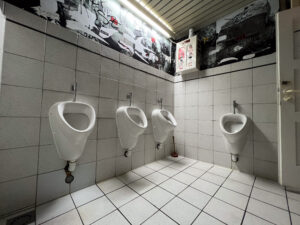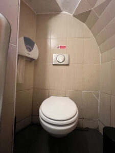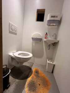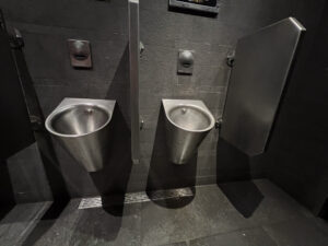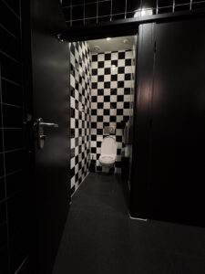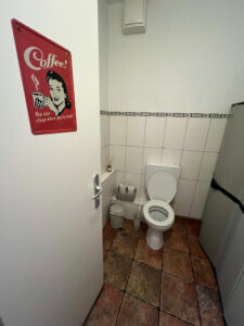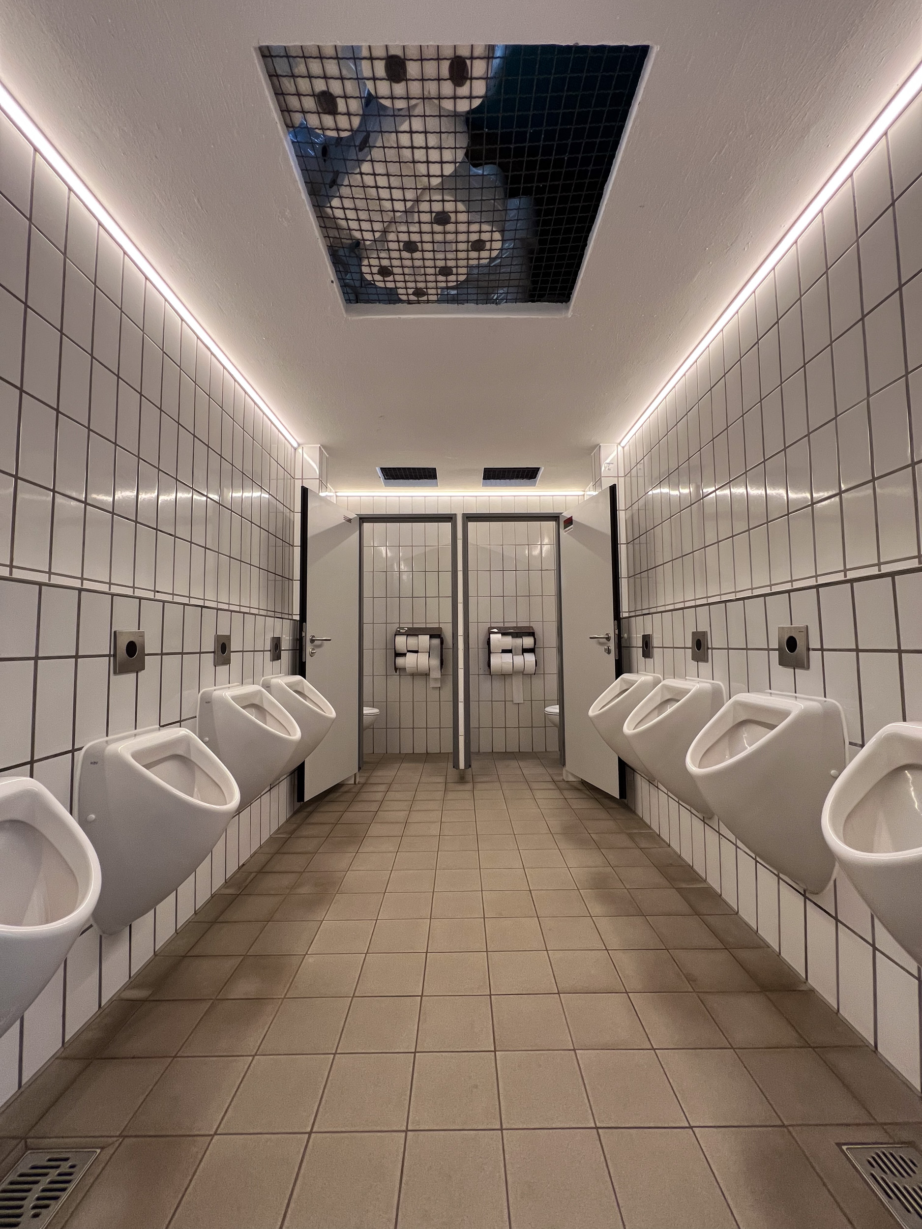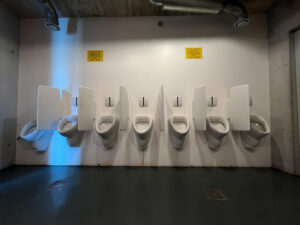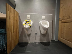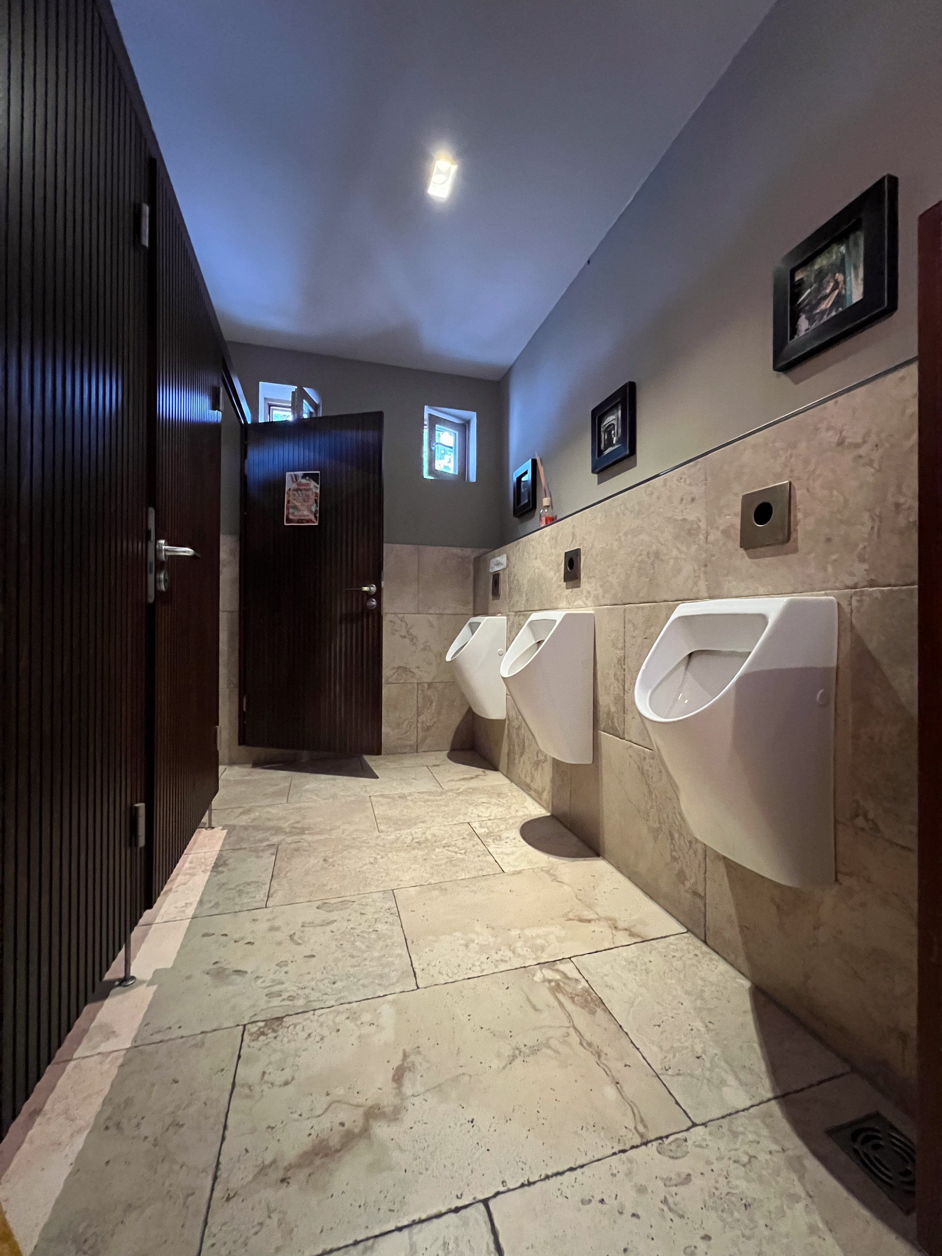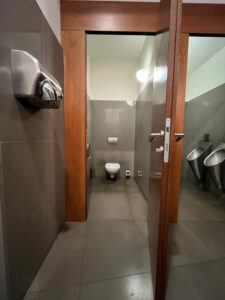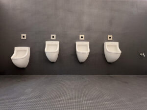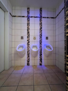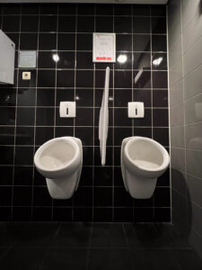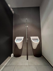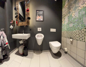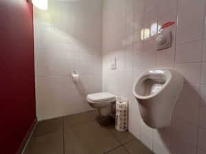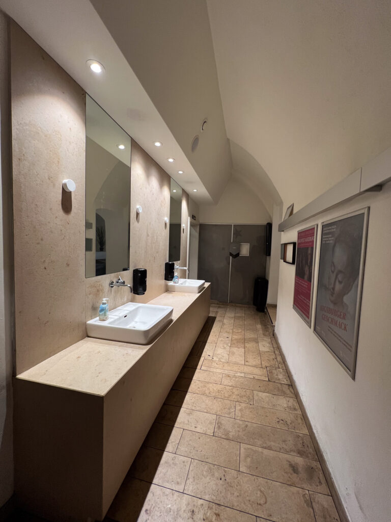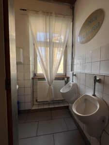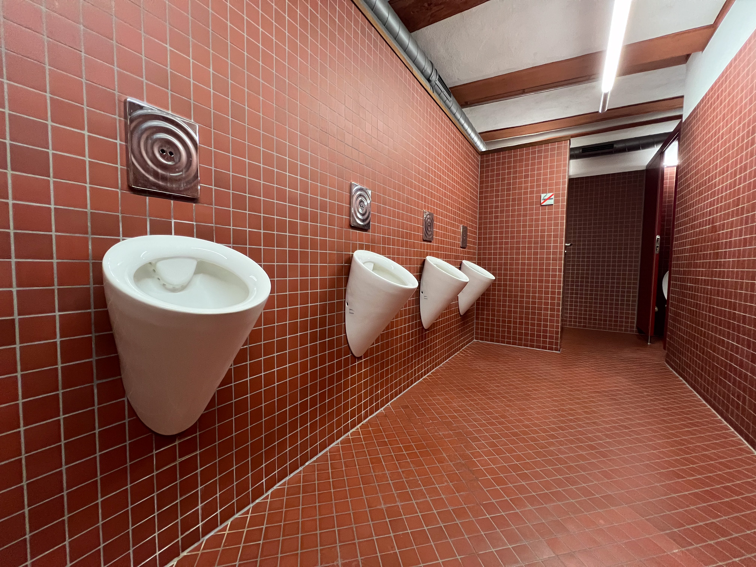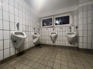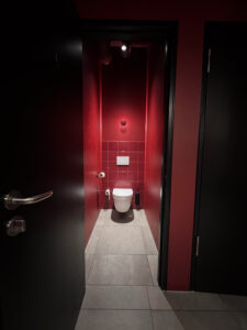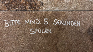 Vom „Wohlfühlen“ wie im Gastraum ist hier keine Spur mehr vorhanden. Eine Kommunikation wie sie am Tisch stattfindet gar nicht möglich. Die keramikbeschichteten Wände schmeißen dir die eigenen Worte dermaßen verstärkt wieder, dass an eine Unterhaltung überhaupt nicht zu denken ist. Daher wohl auch der Ausdruck „stilles Örtchen“ 😉 Die Kälte verweigert dir eine entspannte Haltung, sodass dein Körper dir eine einfache Erleichterung erschwert. Auch der Anblick von Schlauch und Abfluss in der Mitte des Raumes erinnert eher an ein Schlachthaus als an einen täglich zu besuchenden Ort.