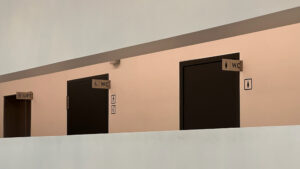 Sowohl physisch als auch atmosphärisch. Schmucklose Umgebung mit weiß gekachelten Wänden.